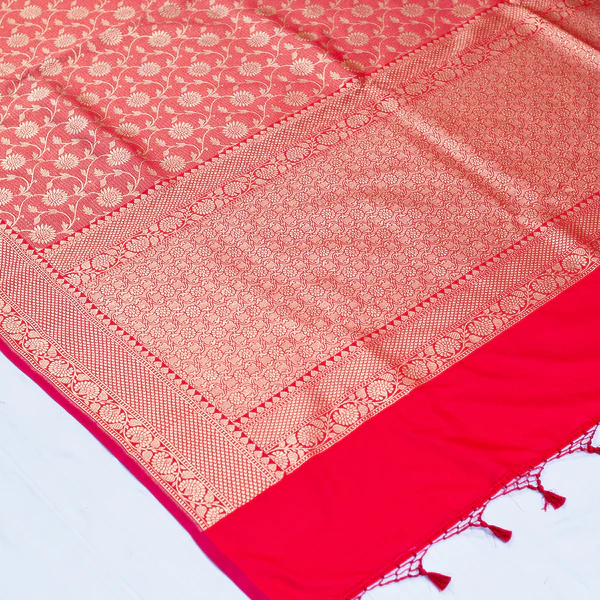 Red Semi Silk Brocade Saree. Crafted from luxurious semi-silk fabric, it features intricate brocade weaving that adds richness and depth to its design. The vibrant red hue exudes grace and confidence, perfect for festive celebrations, weddings, or special occasions. The saree is beautifully complemented by traditional motifs and a subtle sheen, making it an ideal choice for those seeking a blend of tradition and contemporary style. Complete your look with matching jewelry and accessories to effortlessly radiate charm and sophistication.