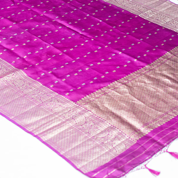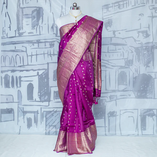 Violet Pure Katan Silk Handloom Banarasi Saree. Crafted with intricate craftsmanship, this saree features rich violet hues complemented by stunning traditional Banarasi zari work that exudes luxury and sophistication. Made from high-quality pure Katan silk, it offers a soft, lustrous feel and regal drape, perfect for festive occasions and special events. Embrace heritage and grace with this exquisite handloom masterpiece, showcasing the artistry of Banarasi weaving in every detail.