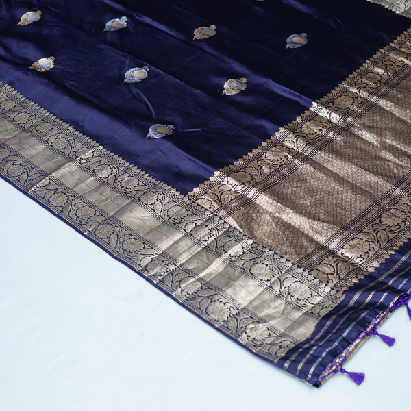 The Blue Pure Katan Silk Handloom Banarasi Saree exudes timeless elegance and luxury. Crafted meticulously on traditional handlooms, this saree features a rich, deep blue hue that radiates sophistication. The pure Katan silk fabric offers a smooth, lustrous texture that drapes beautifully, ensuring comfort and grace. Adorned with intricate Banarasi zari work, including ornate floral and paisley motifs, it showcases the exquisite craftsmanship of Varanasi artisans. Perfect for festive occasions and weddings, this saree combines regal tradition with contemporary finesse, making it a treasured addition to any wardrobe.