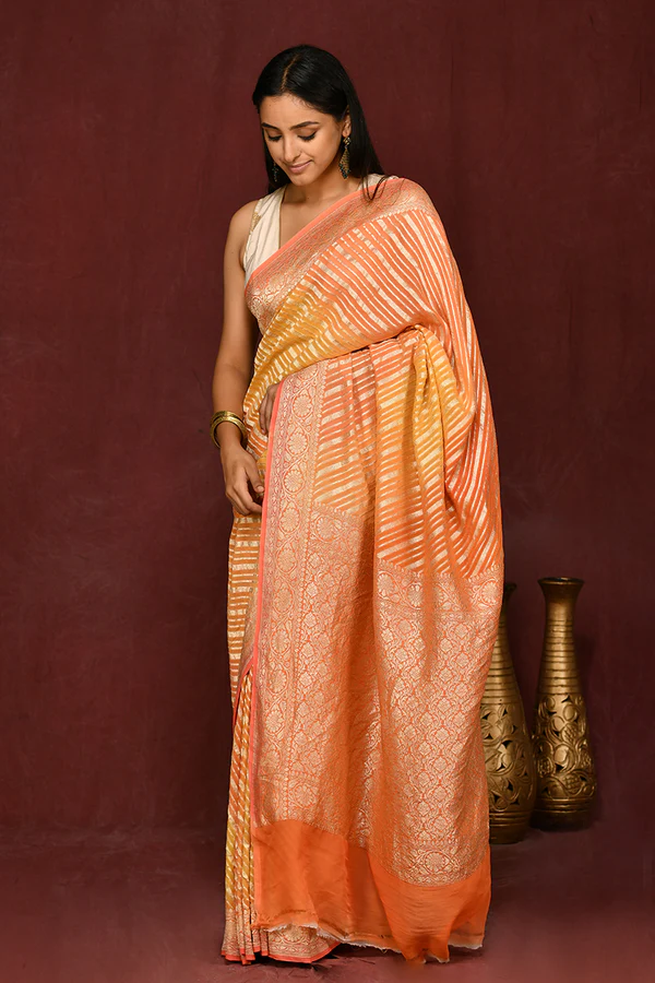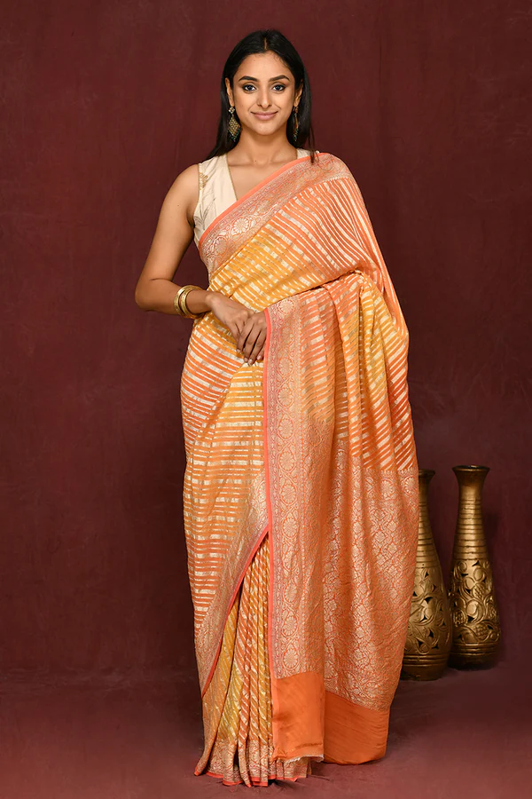 Yellow-Orange Rangkat saree crafted from pure Khaddi Georgette handloom silk. Featuring a harmonious blend of vibrant hues, this saree showcases intricate Rangkat (woven pattern) work that adds a touch of traditional artistry. The lightweight georgette fabric drapes beautifully, offering comfort and elegance for any occasion. Adorned with delicate borders and subtle motifs, this saree is perfect for festivals, weddings, or celebratory events. Elevate your ethnic wardrobe with this exquisite piece that embodies craftsmanship, color, and classic charm.
