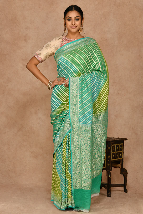 Immerse yourself in the timeless charm of this exquisite saree crafted from pure Khaddi georgette silk. The stunning sea green hue radiates freshness and serenity, making it perfect for both day and evening occasions. Adorned with intricate Rangkat detailing, the saree showcases fine craftsmanship and cultural richness, adding a touch of regal sophistication to your ensemble. The lightweight and flowy texture of the georgette silk ensures graceful drapes and comfortable wear, making it an ideal choice for festivities, celebrations, or special gatherings. Elevate your traditional wardrobe with this beautiful saree that seamlessly blends elegance with artistry.