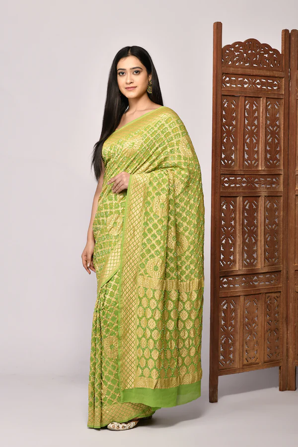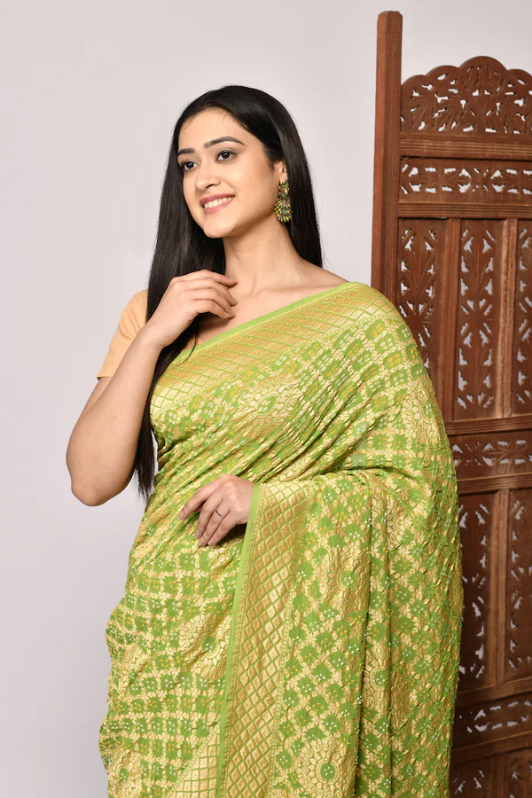our Green Bandhani Pure Khaddi Georgette Handloom Silk Saree. Crafted with traditional bandhani tie-dye artistry, this saree features intricate patterns that exude timeless charm. Made from premium khaddi georgette and handloom silk, it offers a luxurious drape and comfortable feel. Perfect for festive occasions and celebrations, this saree beautifully combines vibrant green hues with artisanal craftsmanship, making it a stunning addition to your wardrobe.
